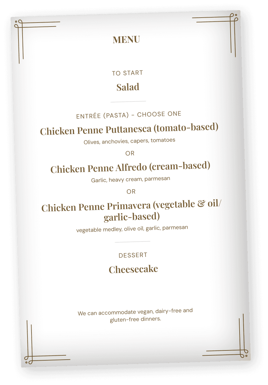 “This is a night you won’t forget. There’s over 8 fantastic live actors and on top of that, the food was top notch” “I actually felt like I was at a wedding reception and it was so fun dressing up and interacting with everyone else.” “This was immersive, unique, and SO SO FUN!”