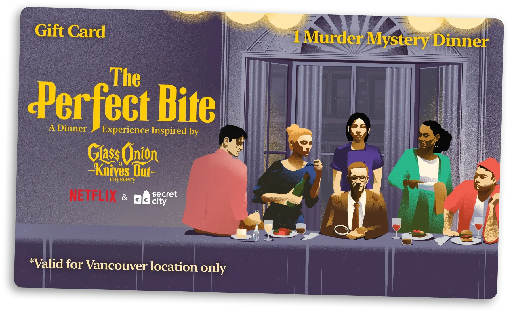Share the thrill of a one-of-a-kind murder mystery dinner experience in Vancouver with The Perfect Bite eGift card.